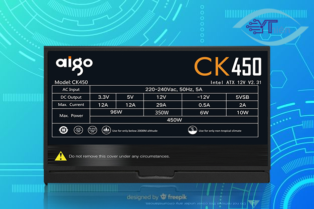 Nguồn máy tính AIGO CK450 - 450W thích hợp với hệ thống ATX 12V 2.3. Cáp chính dài 500mm hỗ trợ case cao cấp với PSU gắn phía dưới.
