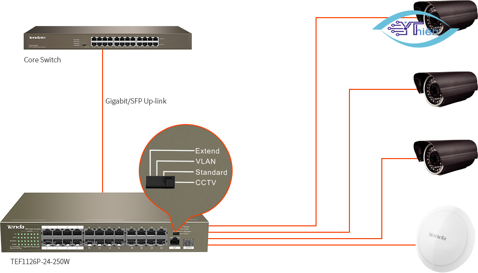 TEF1126P-24-250W là bộ chuyển đổi Tenda PoE cung cấp 24 cổng 10/100 Mbps Base-TX RJ45, 1 cổng RJ45 Base-T RJ45 10/100/1000 Mbps và cổng SFP Base-X 1000 Mbps. Cổng 1-24 tuân theo chuẩn IEEE 802.3af (công suất PoE tối đa: 15.4 W) và chuẩn 802.3at (công suất đầu ra PoE tối đa: 30 W). Công tắc này cung cấp công suất PoE tối đa là 225 W và có thể cấp nguồn và trao đổi dữ liệu với các AP, IP camera và điện thoại IP thông qua cáp CAT5. Nó cũng cung cấp các chế độ quản lý đơn giản như CCTV, VLAN và Extend để giúp giảm chi phí cáp của các thiết bị đầu cuối IP như AP và IP camera.