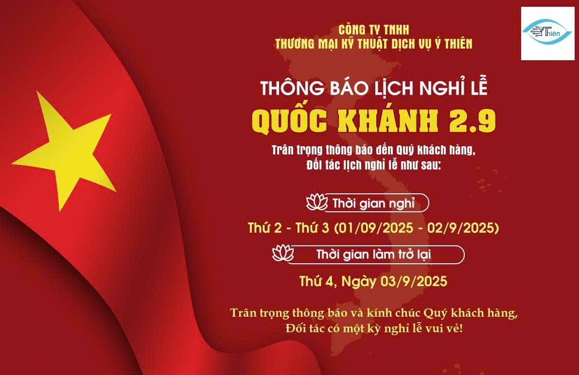 Kính gửi Quý Khách Hàng, Công ty TNHH TM-KT-DV Ý Thiên xin trân trọng thông báo lịch nghỉ lễ Quốc Khánh. Thời gian nghỉ: 01/09/2025 - 02/09/2025. Thời gian làm việc trở lại: 03/09/2025. Kính chúc Quý Khách Hàng một kỳ nghỉ lễ vui vẻ, an toàn và hạnh phúc. Trân trọng cảm ơn Quý Khách đã luôn đồng hành và ủng hộ!